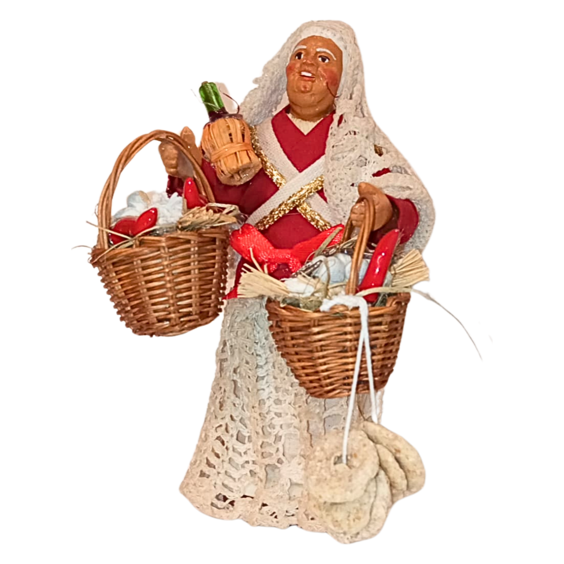 La statuina è in stoffa modellata, con ogni particolare curato a mano nei minimi dettagli. Le espressioni del volto sono realistiche.