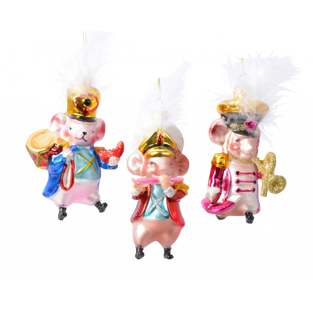 Decorazione per albero. Topolini in vetro colorati con piume. L5.50-W7.20-H13.00cm misure del singolo pezzo