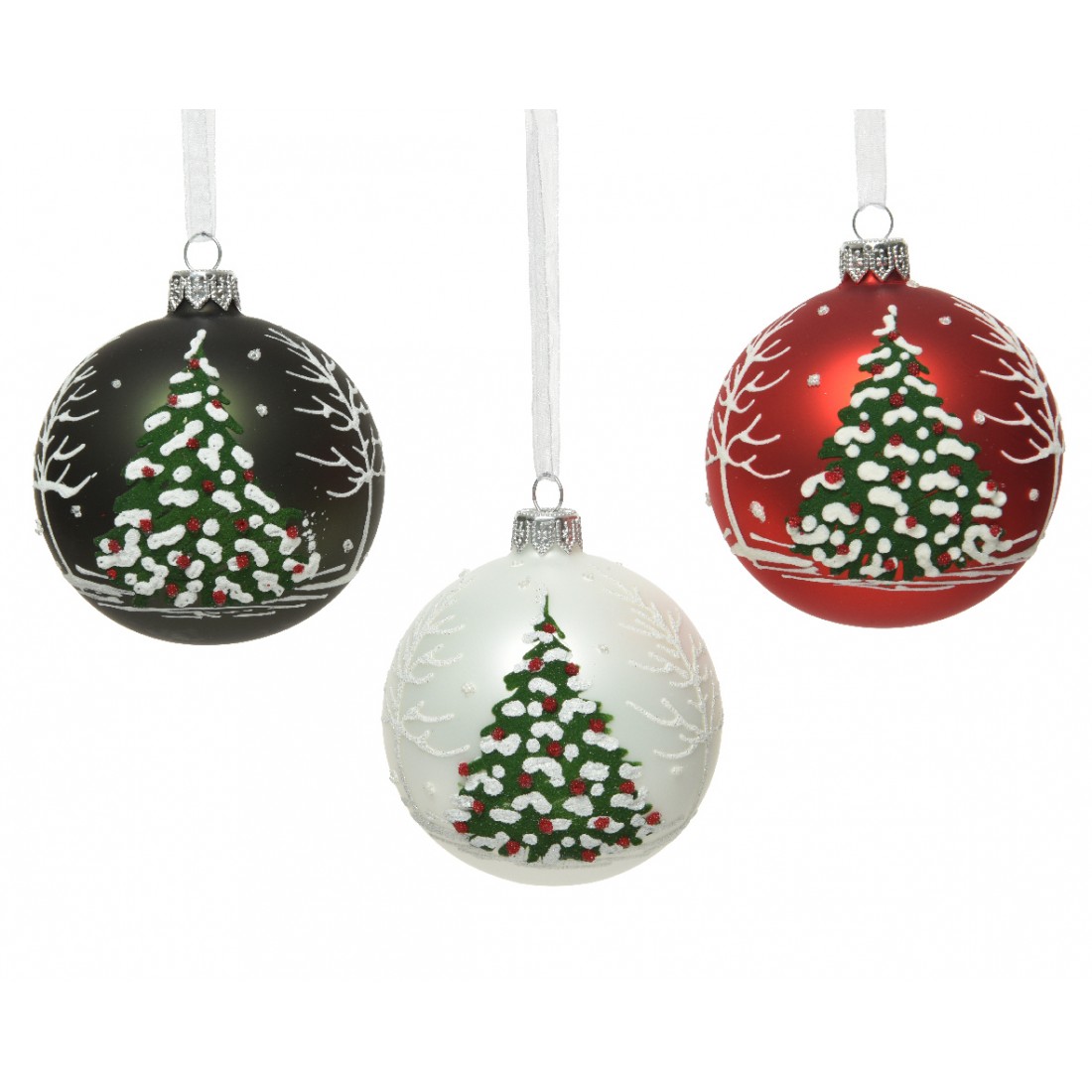 Sfera in vetro colori matt Rosso verde Bianco con albero 3 pz diam.8