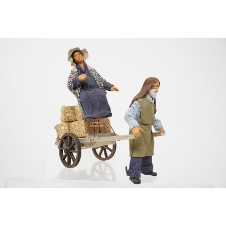 Uomo e donna con carretto cm 10 terracotta e tessuto