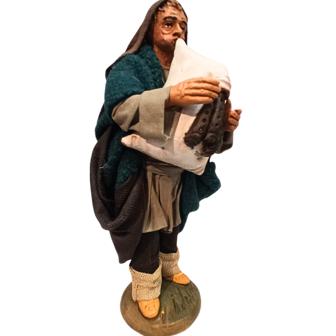 La statuina è in stoffa modellata, con ogni particolare curato a mano nei minimi dettagli. Le espressioni del volto sono realistiche.