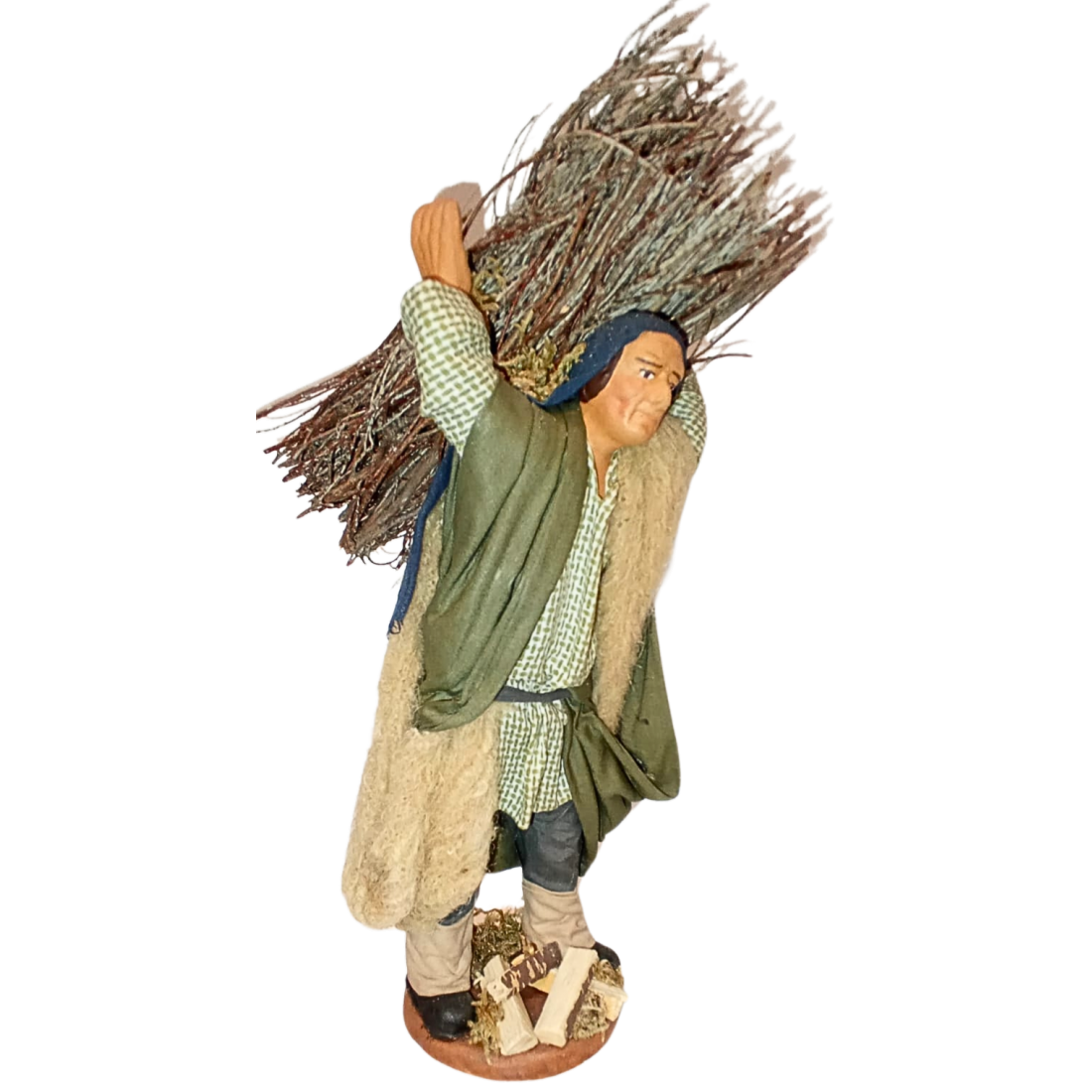 Uomo con fascio legna cm 15 terracotta e tessuto
