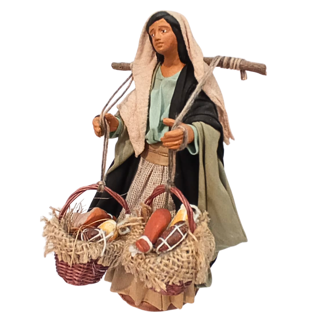 Donna con cesti salumi cm 15 terracotta e tessuto
