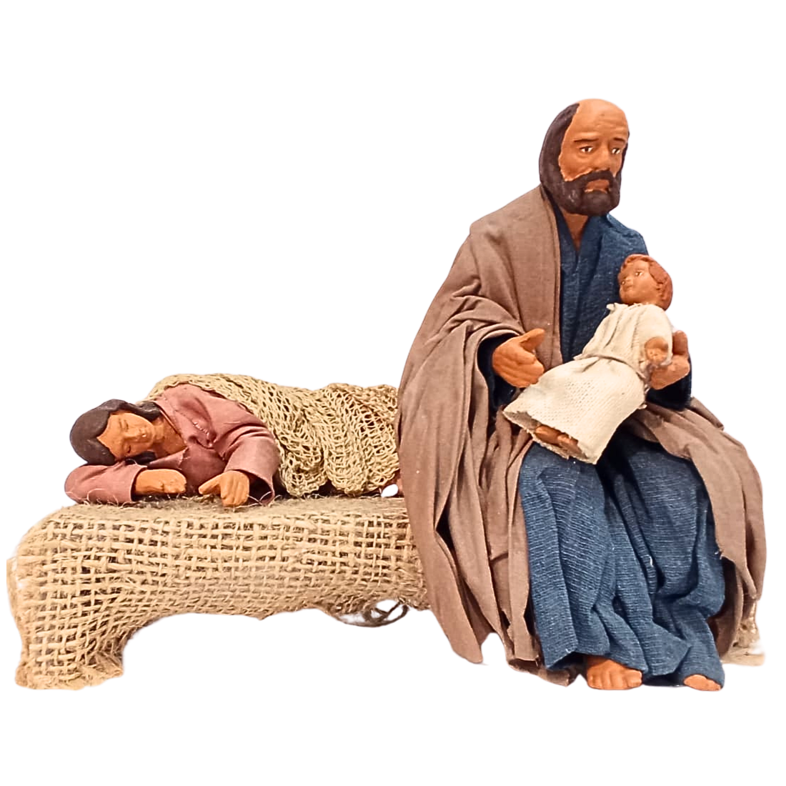 Giuseppe con bambinello in braccio cm 15 terracotta e tessuto