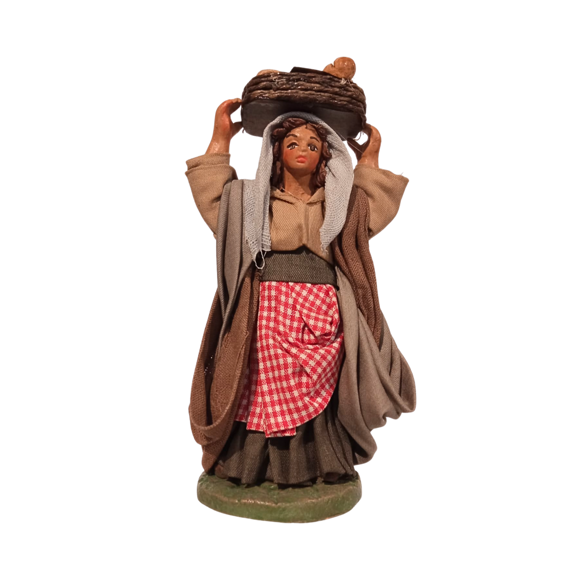 Donna con cesto di pane cm 12 terracotta e tessuto