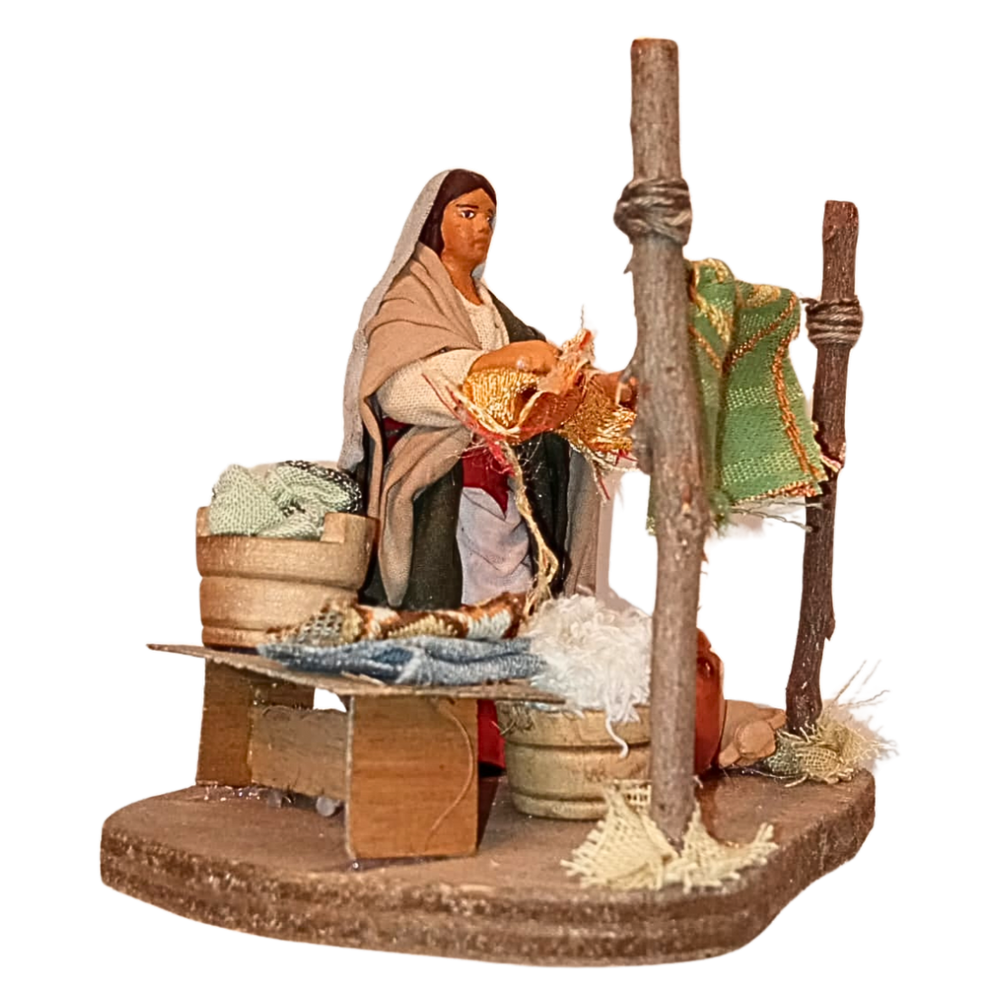 La statuina è in stoffa modellata, con ogni particolare curato a mano nei minimi dettagli. Le espressioni del volto sono realistiche.
