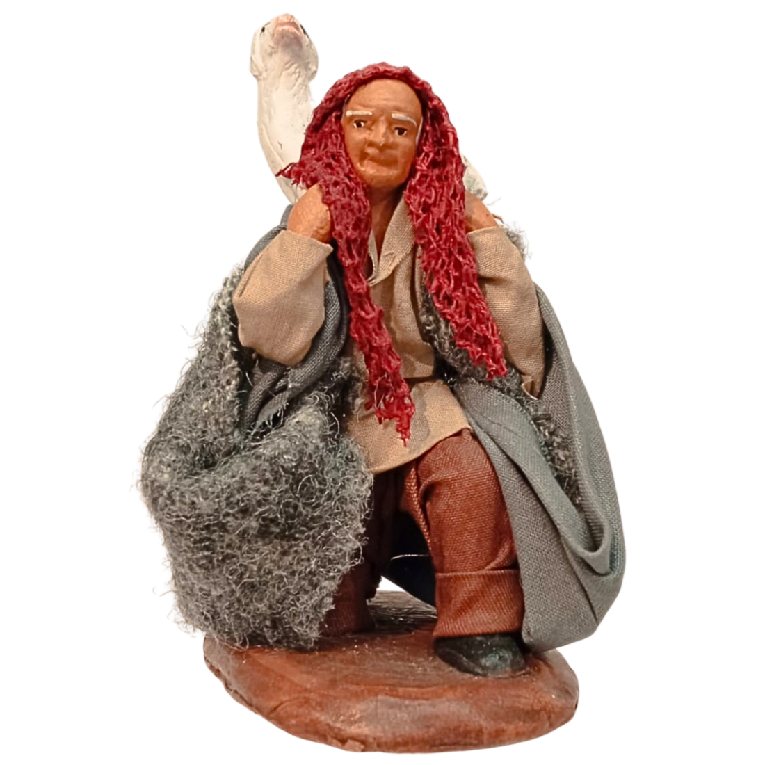 Pastore in ginocchio con pecora cm 10 terracotta e tessuto