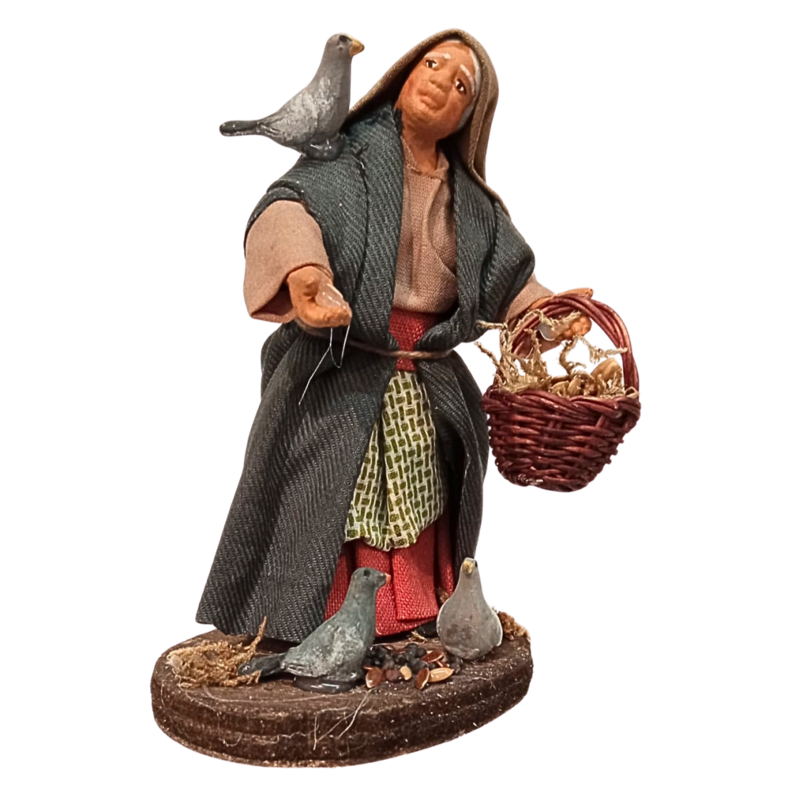 Donna con piccioni e becchime cm 10 terracotta e tessuto