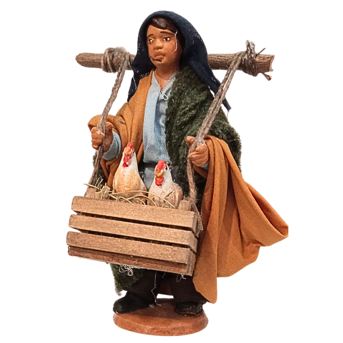 Uomo con cassetta con galline cm 10 terracotta e tessuto