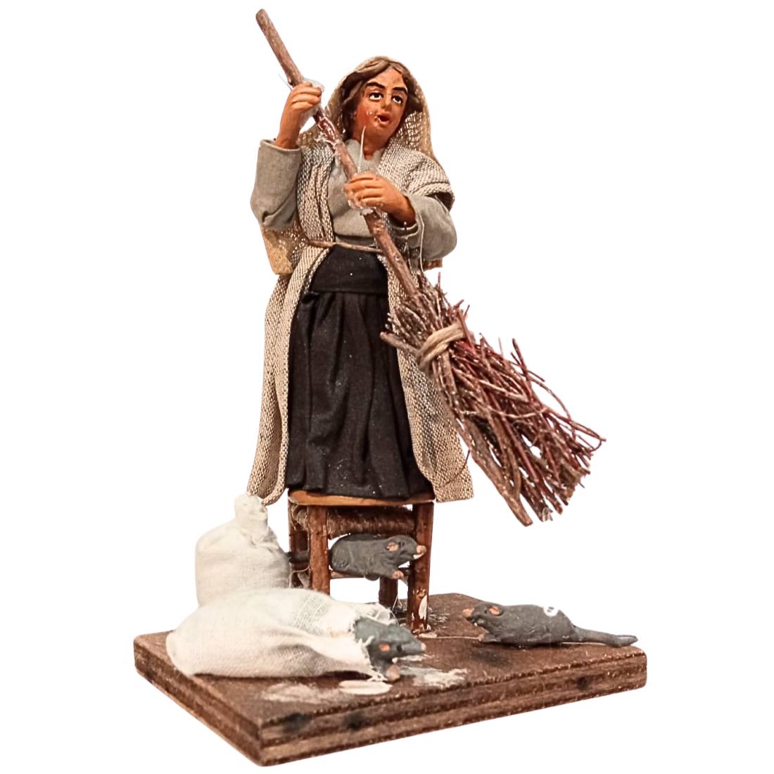 Scena donna su sgabello con topi cm 10 terracotta e tessuto