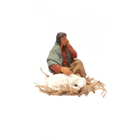 Donna seduta con agnello cm 12 in terracotta e tessuto