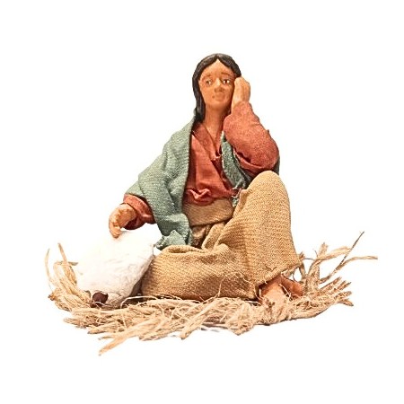 Donna seduta con agnello cm 12 terracotta e tessuto