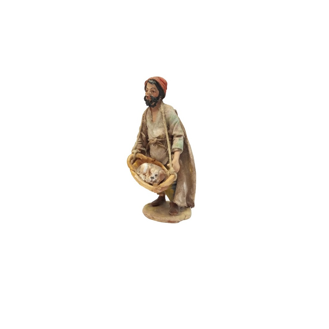 Pastore con cagnolino nel cesto cm 12 in terracotta e tessuto, TERRACOTTA SICILIANA.